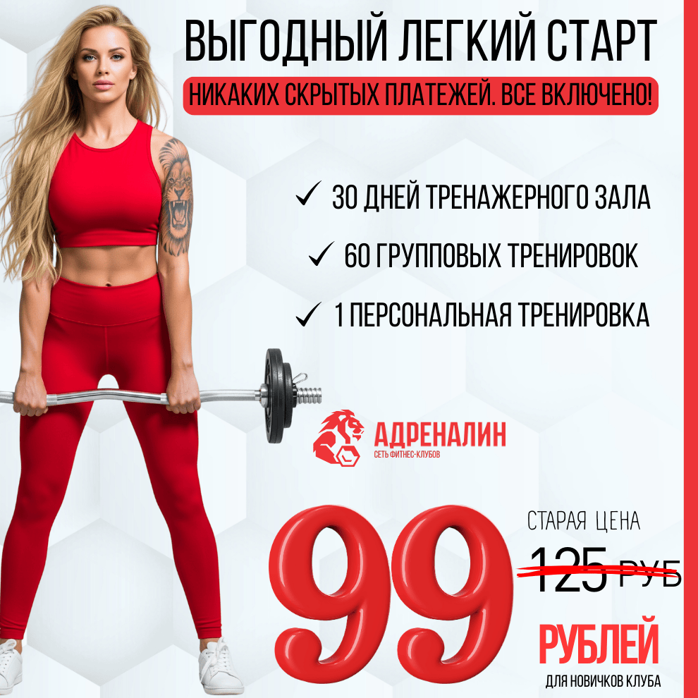 В рамках акции новым членам клуба доступен безлимитный абонемент на 1 месяц и 1 персональная тренировка по специальной цене — 99 руб.